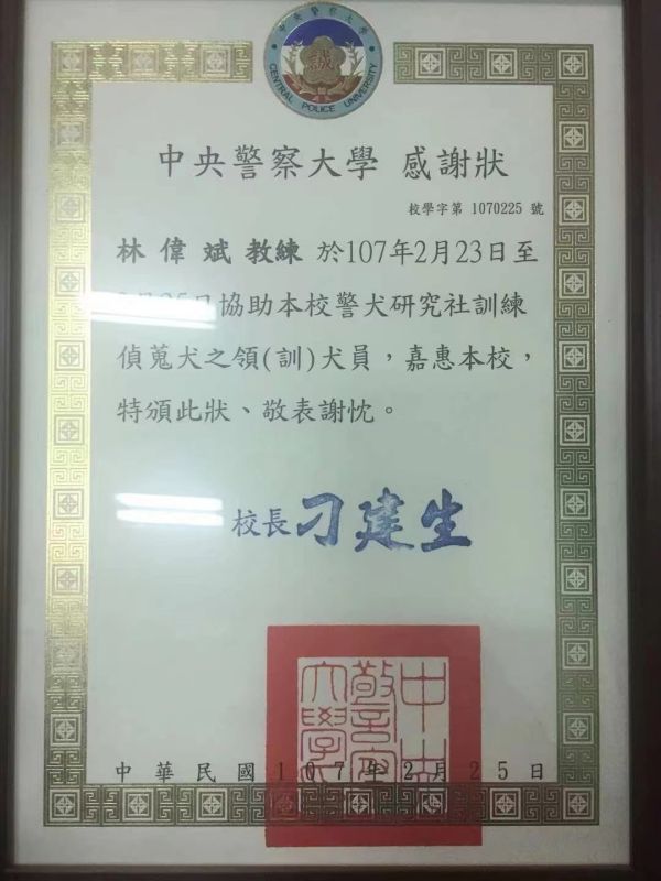 2017年林偉斌受台灣新北巿政府警察局邀請赴台,協助警犬隊訓練偵搜犬之領犬員工作。 2018年林偉斌受警察大學邀請赴台灣,協助警犬研究社訓練偵蒐犬之領犬員工作。